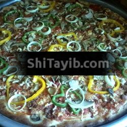 ١. تخلط مقادير العجينة مع بعض وتعجن جيداً حتى تصبح ناعمه لا تلتصق باليد وتترك نص ساعه حتى تخمر. ٢. في مقلاة على النار، يوضغ ملعقه زيت ثم البصل المفروم، اللحمه ويقلب جيداً، تضاف الفليفله والبصل وتحرك حتى تستوي اللحمه ثم توضع البندوره وتترك خمس دقائق، يضاف الملح ورشة فلفل اسمر. ٣. تفرد العجين في صينية الخبز، يمرغ الكاتشب والقليل من الجبن ثم اللحمه المقليه وحلقات البصل والفليفله والزيتون والفطر ثم باقي علبة الجبن باسخدام مبرشه. ٤. توضع الصينية في الفرن على درجة حرارة 200 س تحمر وتقدم.