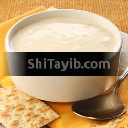 ٢. توضع مصفاة على قدر، يصب الخليط فوقها ويحرك بالملعقة حتى يُصّفى خليط اللبن كلياً من القشدة وأي كتل .