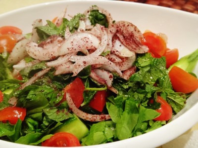 اما بصل فنقطعة شرائح ونمعكه قليلا بالسماق والملح ونضيفة على السلطة